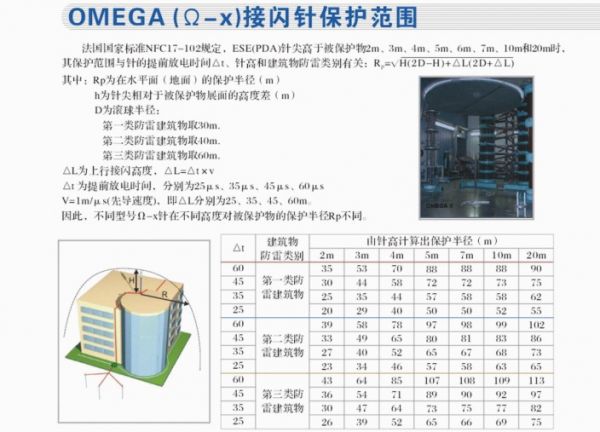 根據法國國家標準NFC—17—102規定,ESE(“提前接閃”的英文縮寫)針尖高于被保護物2m、4m、5m、6m、7m、10m和20m時,其保護范圍與避雷針的提前放電時間△T、針高和建筑物的防雷類別有關: