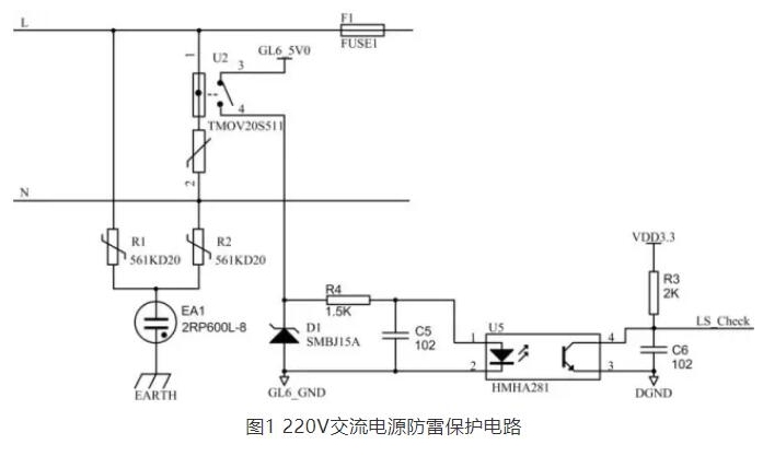 本電路由于采用了金屬氧化鋅壓敏電阻U2,因此能有效地避免傳統(tǒng)的氧化鋅壓敏電阻因短路失效可能帶來的火災(zāi)等安全隱患。與此同時(shí),如果因?yàn)槔讚魮p壞時(shí),其隔離的熔斷保險(xiǎn)絲將同時(shí)熔斷,主機(jī)CPU可以在LS_Check端檢測到相應(yīng)的信號,從而起到雷擊損壞報(bào)警功能。